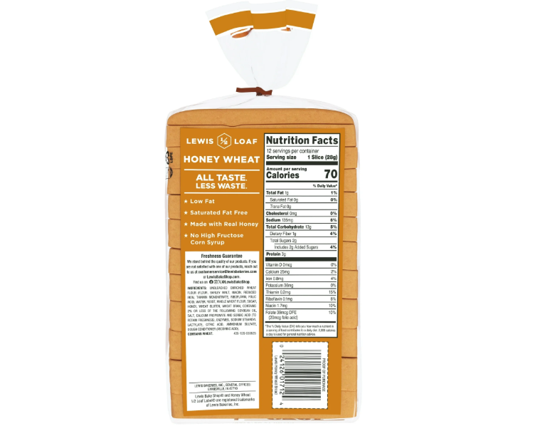 The Lewis Bake Shop Honey Wheat Half Loaf Bread is perfectly soft and sweetened with a hint of real honey. This pre-sliced 1/2 loaf is bursting with flavor, delivering the ideal balance of sweetness and wholesome wheat. Lewis Bake Shop Honey Wheat Half Loaf is baked with high-quality ingredients, including real honey, and has no artificial additives, colors, or corn syrup. At 12 oz, this low-fat, shelf-stable half loaf ensures you always have a tasty option on hand, perfect for a breakfast toast, a lunchtime sandwich, or a midnight snack. Dedicated to baking delicious and nutritious bakery products since 1925, the Lewis Family knows you will love the Lewis Bake Shop Honey Wheat Half Loaf.