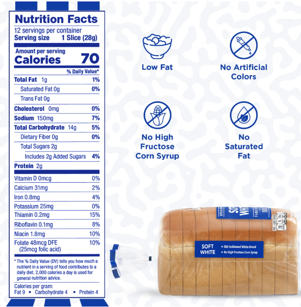 UNBLEACHED ENRICHED WHEAT FLOUR [FLOUR, BARLEY MALT, NIACIN (VITAMIN B3), IRON, THIAMIN MONONITRATE (VITAMIN B1), RIBOFLAVIN (VITAMIN B2), FOLIC ACID (VITAMIN B9)], WATER, YEAST, WHEAT GLUTEN, CONTAINS 2% OR LESS OF THE FOLLOWING: SOYBEAN OIL, SALT, DOUGH CONDITIONERS (SODIUM STEAROYL LACTYLATE, ETHOXYLATED MONO- AND DIGLYCERIDES, ASCORBIC ACID), CALCIUM PROPIONATE (TO RETAIN FRESHNESS), SOY FLOUR, YEAST NUTRIENTS (MONOCALCIUM PHOSPHATE, AMMONIUM SULFATE), SOY LECITHIN. Contains Soy, Wheat.