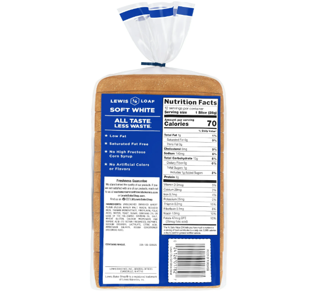 The Lewis Bake Shop Soft White Half Loaf Bread brings delectable, straight-from-the-bakery taste home to you and your family. This pre-sliced 1/2 loaf is soft and smooth, making it a delicious base for any recipe. The Lewis Bake Shop Soft White Half Loaf is made with no high fructose corn syrup, color, or additives. Whether you're enjoying decadent buttered toast, scrumptious chicken salad sandwiches, or a classic peanut butter and jelly, you can count on Lewis Bake Shop Soft White Half Loaf for taste and quality that even the pickiest of eaters will enjoy. At 12 oz, this shelf-stable half loaf ensures you always have a convenient, tasty option on hand for your busy schedule. Dedicated to baking delicious and nutritious bakery products since 1925, the Lewis Family is confident you’ll love the Lewis Bake Shop Soft White Half Loaf.