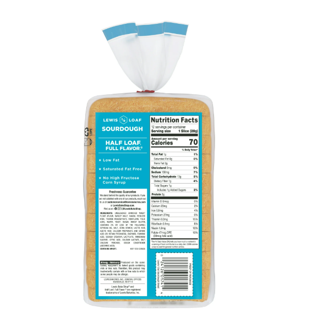 The Lewis Bake Shop Sourdough Half Loaf Bread strikes the perfect balance of tangy richness and irresistible flavor in every bite. Baked with high-quality ingredients and free from artificial colors and high-fructose corn syrup, this half loaf brings bold flavor to any meal. Whether you're crafting a classic sourdough sandwich, toasting it to golden perfection, or simply savoring it on its own, this shelf-stable 12 oz loaf adds a burst of bakery-fresh goodness. Dedicated to baking delicious and wholesome products since 1925, the Lewis Family knows you’ll love the satisfying flavor of the Lewis Bake Shop Sourdough Half Loaf.