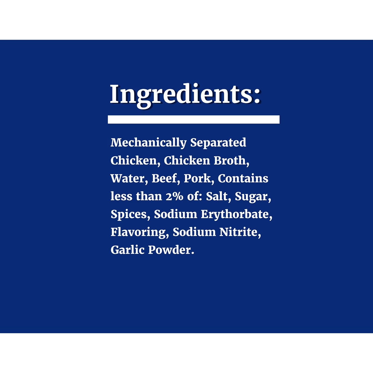 Ingredients: Mechanically Separated Chicken, Chicken Broth, Water, Beef, Pork, Contains less than 2% of: Salt, Sugar, Spices, Sodium Erythorbate, Flavoring, Sodium Nitrite, Garlic Powder.
