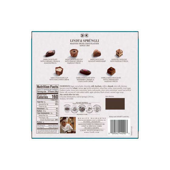 Sugar, cocoa butter, chocolate, milk, hazelnuts, milkfat, almonds, skim milk, dextrose, glucose syrup (from wheat), lactose, soy lecithin (emulsifier), wheat flour, coffee, cream powder, invert sugar, raspberry puree, lemon juice concentrate, barley malt powder, cherry juice concentrate, natural and artificial flavors, salt, coconut oil, color added (radish, apple, spirulina, black currant), caramel sugar syrup.