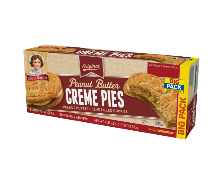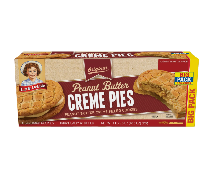 Soft and rich in flavor, Little Debbie Peanut Butter Creme Pies make a great snack for any peanut butter lover. Fluffy peanut butter creme is layered between two homestyle peanut butter cookies creating a delectable homemade taste that is tough to resist! Sweet and delicious, you will always want these classic Peanut Butter Creme Pies on hand for a hearty snack. Pack these individually wrapped sandwich cookies for long road trips, as a special treat for lunchtime, or just unwrap and enjoy on the spot!
