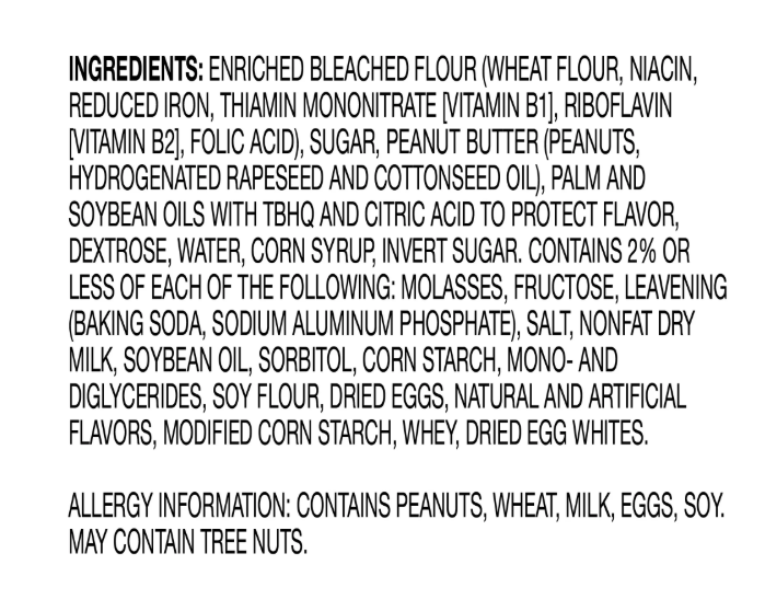 Enriched Bleached Flour (Wheat Flour, Niacin, Reduced Iron, Thiamin Mononitrate Vitamin B1, Riboflavin Vitamin B2, Folic Acid), Sugar, Peanut Butter (Peanuts, Peanut Oil, Palm Oil and/or Hydrogenated Vegetable Oils Cottonseed, Rapeseed, and/or Soybean), Palm and Soybean Oils with TBHQ and Citric Acid to Protect Flavor, Dextrose, Water, Corn Syrup, Invert Sugar, Contains 2% or Less of Each of the Following: Molasses, Fructose, Leavening (Baking Soda, Sodium Aluminum Phosphate), Salt, Nonfat Dry Milk, Soybean Oil, Sorbitol, Corn Starch, Mono- and Diglycerides, Soy Flour, Dried Eggs, Natural and Artificial Flavors, Modified Corn Starch, Whey (Milk), Dried Egg Whites.