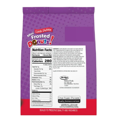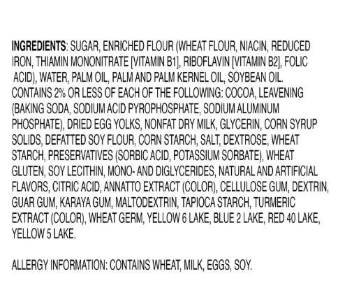 Enriched Wheat Flour (Wheat Flour, Niacin, Reduced Iron, Thiamin Mononitrate Vitamin B1, Riboflavin Vitamin B2, Folic Acid, Sugar, Water, Palm Oil, Palm and Palm Kernel Oil Contains 2% or Less of Each of the Following, Cocoa, Nonfat Dry Milk, Egg Yolks, Soy Flour, Corn Syrup Solids, Soybean Oil, Leavening (Baking Soda, Sodium Acid Pyrophosphate, Sodium Aluminum Phosphate), Mono and Diglycerides, Soy Lecithin, Glycerin, Dextrose, Salt, Wheat and Tapioca Starches, Wheat Germ, Corn Starch, Natural and Artificial Flavors, Sorbic Acid and Potassium Sorbate (to Preserve Freshness), Cellulose and Guar and Karaya Gums, Dextrin, Citric Acid, Maltodextrin, Annatto Extract, Turmeric Extract, Yellow Cake, Blue Lake, Red 40 Lake, Yellow 5 Lake.