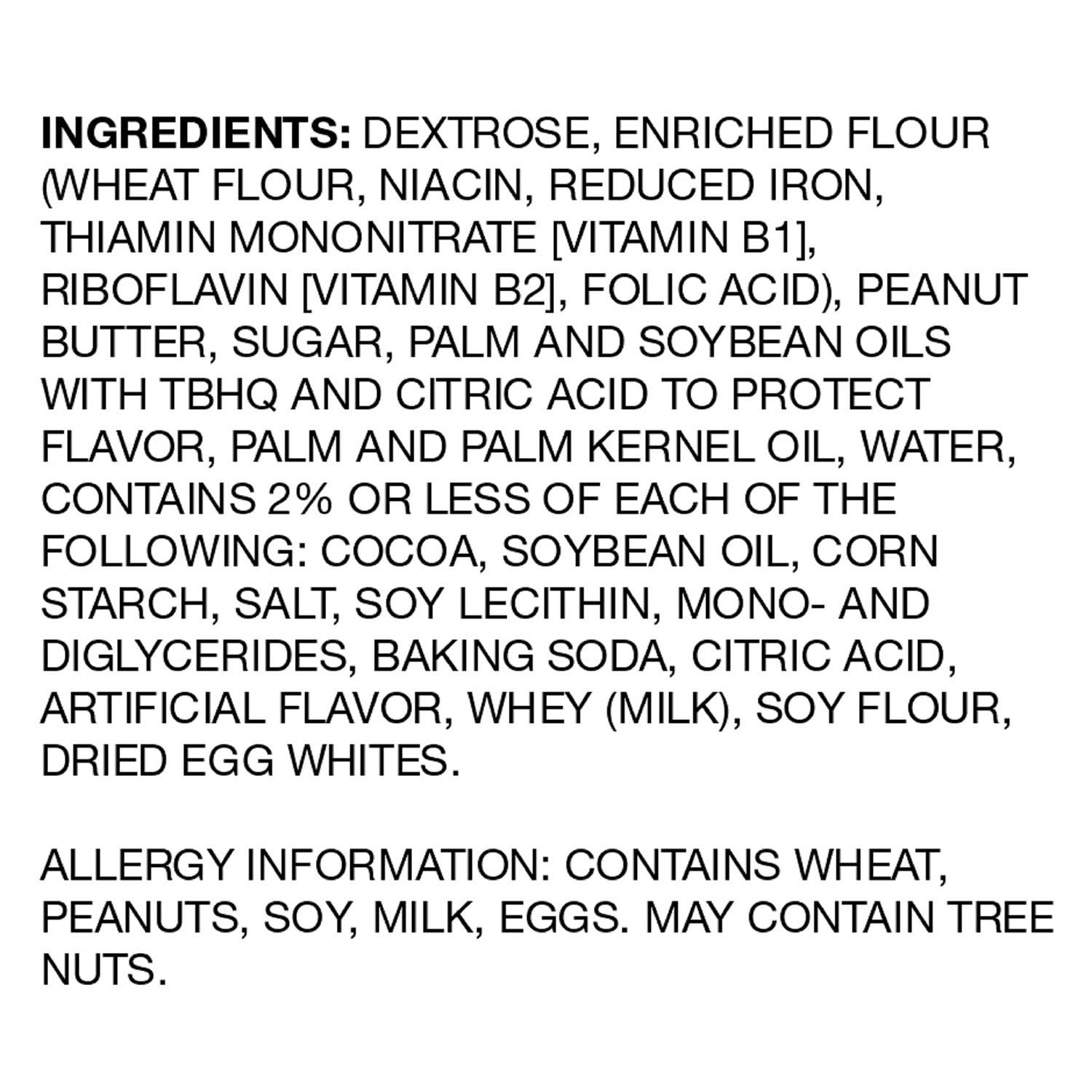 Ingredients: Dextrose, Enriched Flour (Wheat Flour, Niacin, Reduced Iron, Thiamin Mononitrate [Vitamin B1], Riboflavin [Vitamin B2], Folic Acid), Peanut Butter, Sugar, Palm And Soybean Oils With Tbhq And Citric Acid To Protect Flavor, Palm And Palm Kernel Oil, Water, Contains 2% Or Less Of Each Of The Following: Cocoa, Soybean Oil, Corn Starch, Salt, Soy Lecithin, Mono- And Diglycerides, Baking Soda, Citric Acid, Artificial Flavor, Whey (Milk), Soy Flour, Dried Egg Whites.