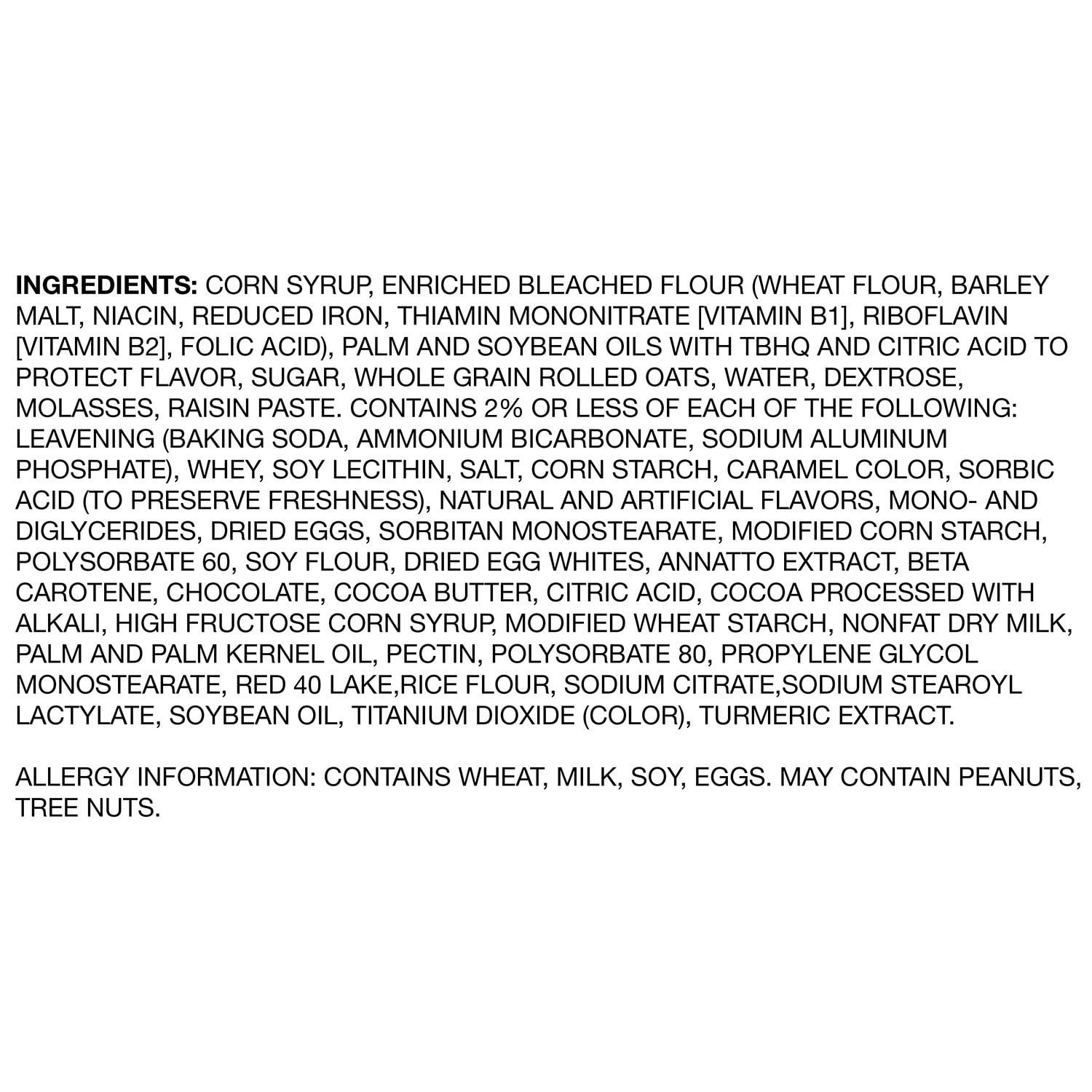 Ingredients: Corn Syrup, Enriched Bleached Flour (Wheat Flour, Barley Malt, Niacin, Reduced Iron, Thiamin Mononitrate [Vitamin B1], Riboflavin [Vitamin B2], Folic Acid), Palm and Soybean Oils with TBHQ and Citric Acid to Protect Flavor, Sugar, Whole Grain Rolled Oats, Water, Dextrose, Molasses, Raisin Paste. Contains 2% or less of each of the following: Leavening (Baking Soda, Ammonium Bicarbonate, Sodium Aluminum Phosphate), Whey, Soy Lecithin, Salt, Corn Starch, Caramel Color, Sorbic Acid (to Preserve Freshness), Natural and Artificial Flavors, Mono- and Diglycerides, Dried Eggs, Sorbitan Monostearate, Modified Corn Starch, Polysorbate 60, Soy Flour, Dried Egg Whites, Annatto Extract, Beta Carotene, Chocolate, Cocoa Butter, Citric Acid, Cocoa Processed with Alkali, High Fructose Corn Syrup, Modified Wheat Starch, Nonfat Dry Milk,Palm and Palm Kernel Oil, Pectin, Polysorbate 80, Propylene Glycol Monostearate, Red 40 Lake, Rice Flour, Sodium Citrate, Sodium Stearoyl Lactylate, Soybean Oil, Titanium Dioxide (Color), Turmeric Extract.