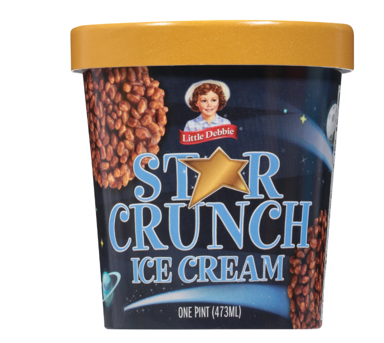 A cold and creamy twist on a classic treat. Our family-owned brands, Little Debbie and Hudsonville, crafted this delicious Star Crunch inspired ice cream to make special moments even sweeter. Indulge in the rich, caramel flavored ice cream, punctuated with fudge and delightful chocolate crispies, all packed into a conveniently sized 16oz pint. Contains milk and soy. Made in a facility that also processes eggs, wheat, peanuts and tree nuts.