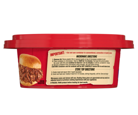 Important: Do not use container in conventional, convection or toaster ovens. Microwave Directions: 1. Remove lid. Pierce plastic film in several spots on top of microwave container to vent. 2. Place container in microwave. Heat on high for 1-1/2 minutes. Peel back film and stir contents. Re-cover with film and continue to heat for 1 to 1-1/2 minutes or until hot. Let stand for 1 minute. 3. Remove container from microwave using handles. Stir well before serving. Caution: Container and its contents will be hot. Carefully remove film to avoid steam burns. Stove Top Directions: 1. Empty meat and sauce into 2-quart saucepan. 2. Cover and heat over medium heat for 6-8 minutes, stirring frequently, until hot. Serve and enjoy! Microwave oven and stoves will vary. Heating times given are approximate and may need to be adjusted based on previous cooking experiences with your appliances.