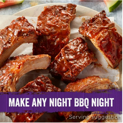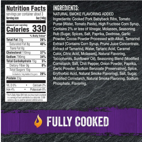 Cooked Pork Babyback Ribs, Tomato Puree (Water, Tomato Paste), High Fructose Corn Syrup, Contains 2% or Less of Vinegar, Seasoning Rub (Sugar, Spices, Salt, Paprika, Dextrose, Garlic Powder, Cocoa Powder Processed with Alkali, Tamarind Extract [Contains Corn Syrup, Prune Juice Concentrate, Extract of Tamarind, Water, Tartaric Acid, Caramel Color, Citric Acid, Molasses], Natural Flavoring, Tocopherols, Sunflower Oil), Molasses, Seasoning Blend (Modified Cornstarch, Salt, Chili Pepper, Onion Powder, Paprika, Garlic Powder, Sodium Benzoate [Preservative], Spice, Erythorbic Acid, Natural Smoke Flavoring), Salt, Sugar, Modified Cornstarch, Natural Smoke Flavoring, Sodium Phosphate, Flavoring.