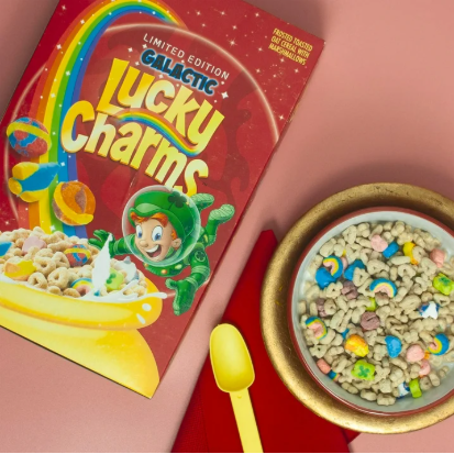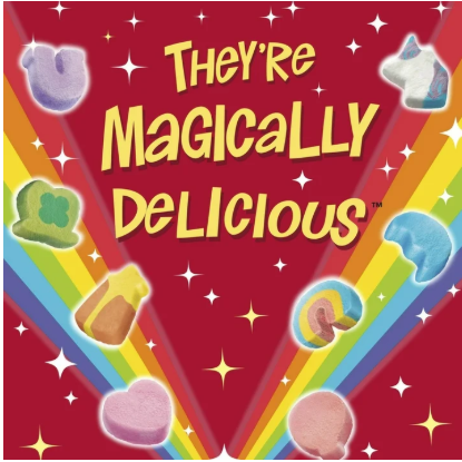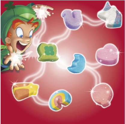 MARSHMALLOW CEREAL: A frosted toasted cereal featuring Lucky's classic marshmallow hearts, stars, horseshoes, clovers, blue moons, unicorns, rainbows, and tasty red balloons; It's magically delicious