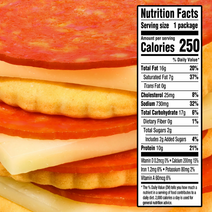 MOZZARELLA PASTEURIZED PREPARED CHEESE PRODUCT (PART-SKIM MILK, WATER, MILK PROTEIN CONCENTRATE, CONTAINS LESS THAN 2% OF SALT, SODIUM CITRATE, MILKFAT, CHEESE CULTURE, SORBIC ACID AS A PRESERVATIVE, ENZYMES, VITAMIN A PALMITATE, WITH SUNFLOWER LECITHIN ADDED FOR SLICE SEPARATION), CONTAINS: MILK; CRACKERS (ENRICHED WHEAT FLOUR [FLOUR, NIACIN, REDUCED IRON, THIAMINE MONONITRATE, RIBOFLAVIN, FOLIC ACID], PALM OIL, SUGAR, VEGETABLE OIL [CANOLA, AND/OR SOYBEAN, AND/OR PALM OIL], CONTAINS 2% OR LESS OF SALT, LEAVENING [BAKING SODA, AMMONIUM BICARBONATE, MONOCALCIUM PHOSPHATE], SOY LECITHIN, NATURAL FLAVORS), CONTAINS: WHEAT, SOY; PEPPERONI (PORK, SALT, SPICES [CONTAINS MUSTARD], DEXTROSE, OLEORESIN OF PAPRIKA, FLAVORING, GARLIC POWDER, LACTIC ACID STARTER CULTURE, SODIUM NITRITE).