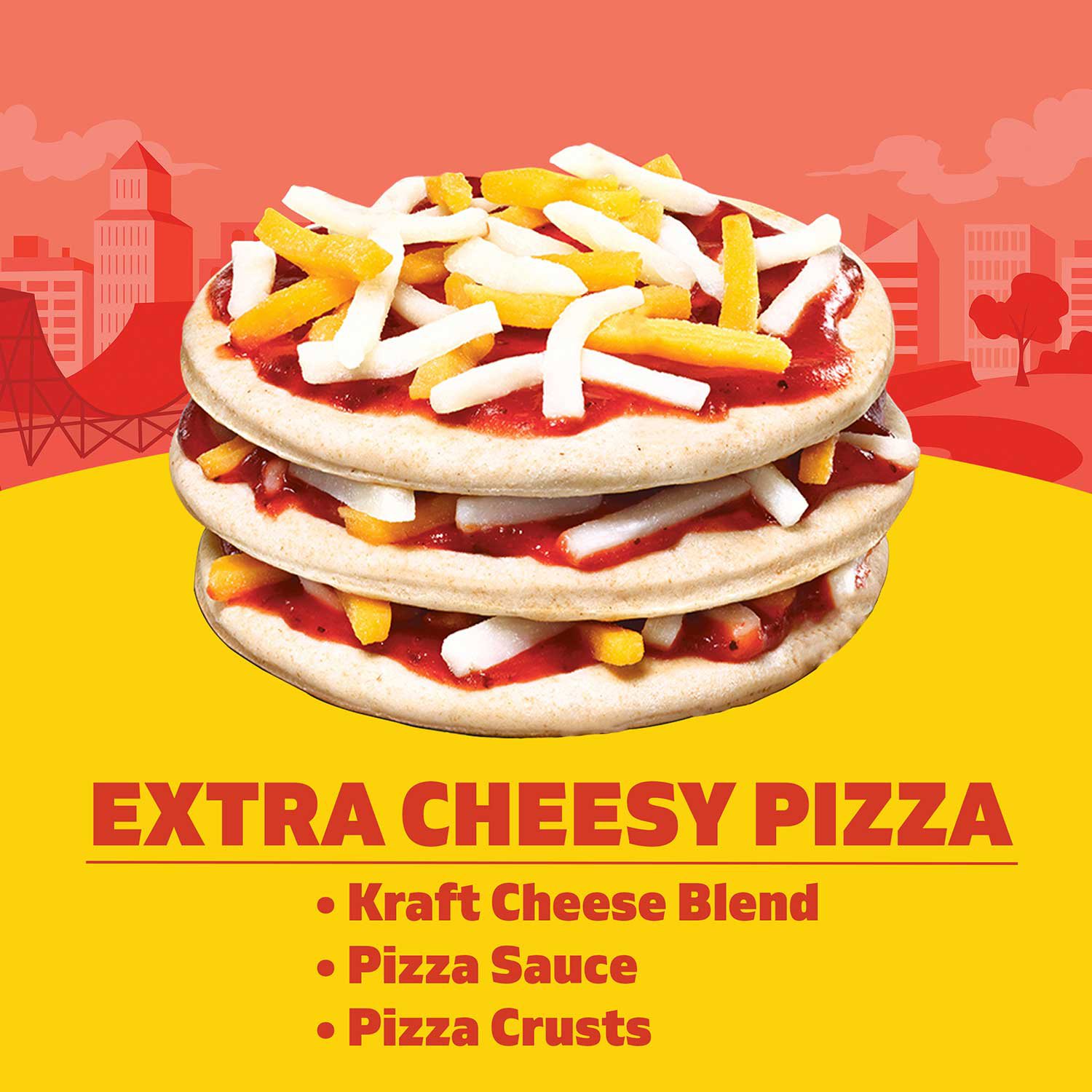 - Variety pack of Extra Cheesy Pizza and Pizza With Pepperoni