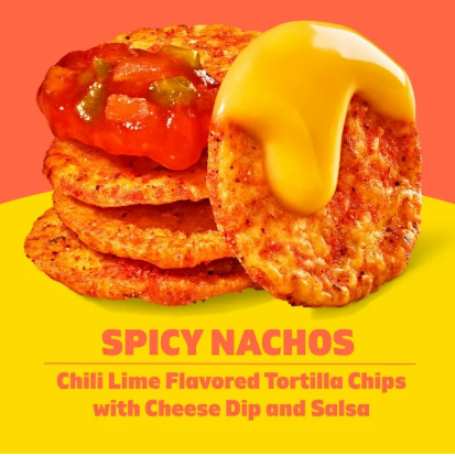 Chili Lime Flavored Tortilla Chips (Ground Yellow Corn, Vegetable Oil [Contains One or More of Corn, Sunflower, Safflower, or Canola Oil], Corn Maltodextrin, Sugar, Citric Acid, Corn Starch, Monosodium Glutamate, Spice, Autolyzed Yeast Extract, Soybean Oil, Onion Powder, Natural Flavor, Yellow 6 Lake, Red 40 Lake, Modified Corn Starch, Disodium Guanylate, Disodium Inosinate, Milk Lactose). Nacho Cheese (Whey, Milk, Canola Oil, Dried Corn Syrup, Sodium Phosphates, Contains Less than 2% of Jalapeno Peppers, Salt, Whey Protein Concentrate, Lactic Acid, Sodium Alginate, Calcium Phosphate, Vinegar, Potassium Chloride, Sorbic Acid as a Preservative, Milkfat, Cheese Culture, Enzymes, Natural Flavor, Apocarotenal [Color]). Salsa (Water, Tomato Paste, Green Chili Peppers, Vinegar, Dehydrated Onions, Contains Less than 2% of High Fructose Corn Syrup, Food Starch Modified, Jalapeno Peppers, Salt, Green Bell Peppers, Garlic Powder, Sodium Benzoate and Potassium Sorbate as Preservatives, Citric Acid, Spice).