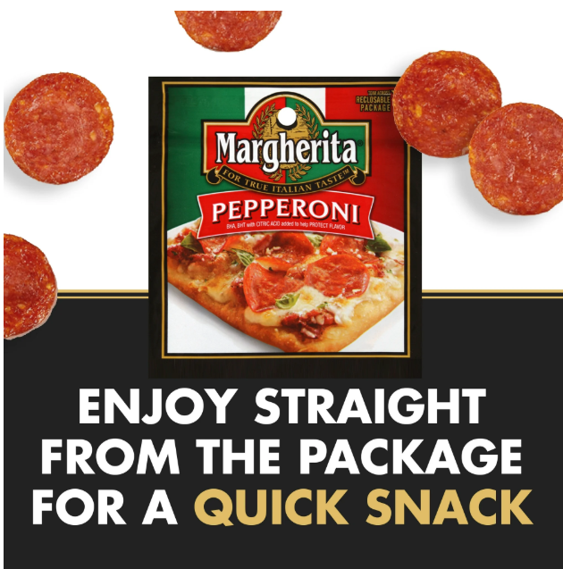 Stack these fully cooked meat slices onto a platter of cheese and crackers for simply entertaining the Italian way, or toss a handful of slices into an antipasto salad, or make a pepperoni calzone with them for hearty family meals. Whether thin crust or deep dish is your favorite, these pepperoni slices make the perfect pizza toppings for mouth-pleasing flavor. A resealable package protects these ready to eat pepperoni slices in the fridge and provides easy access for fast meal prep. For true Italian taste, choose Margherita.