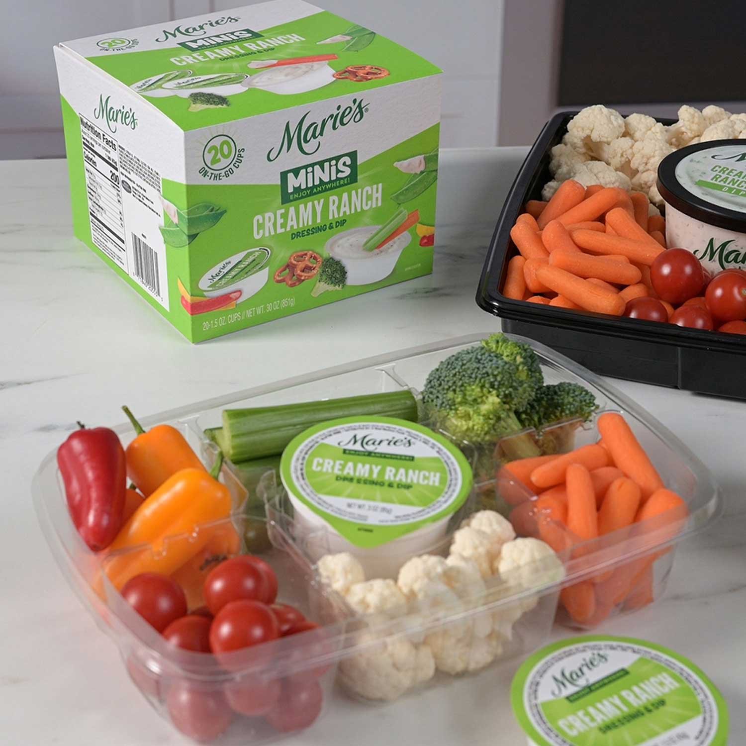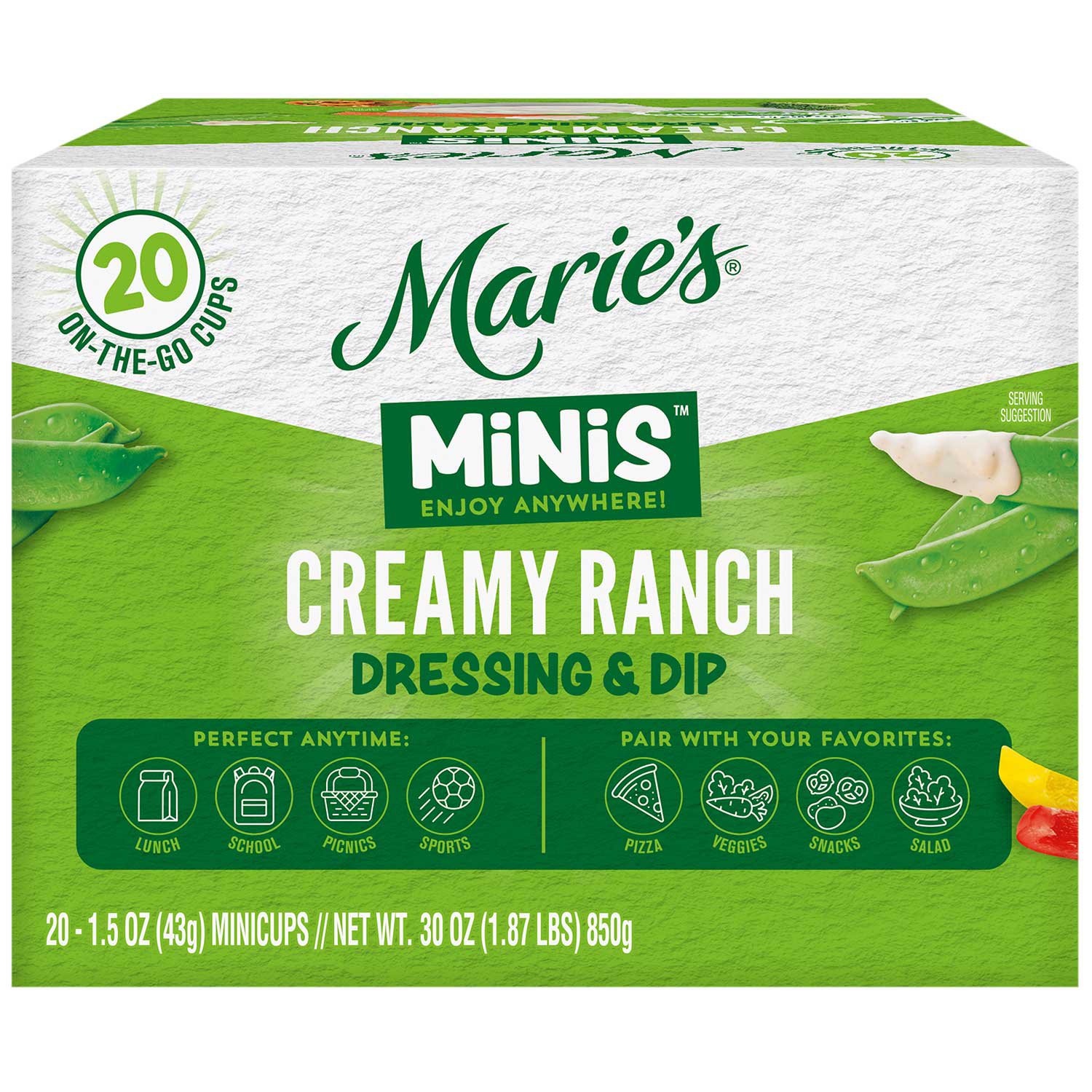 Marie’s® Minis™ Creamy Ranch Dressing & Dip comes in a handy 20-count pack of 1.5oz single-serve containers, making it simple to enjoy ranch dressing anytime, anywhere. These perfectly portioned servings are ideal for quick snacks, meals, or on-the-go moments.