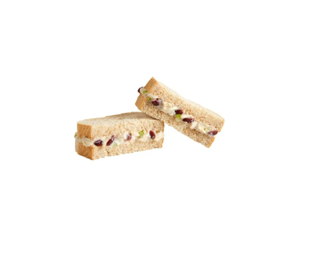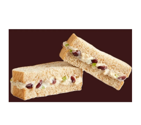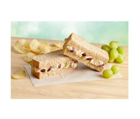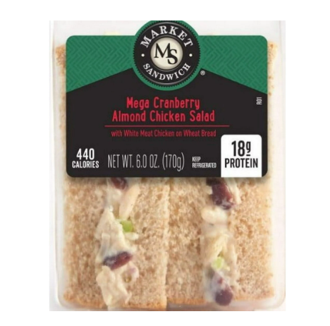 CRANBERRY ALMOND CHICKEN SALAD [COOKED WHITE MEAT CHICKEN, SALAD DRESSING (SOYBEAN OIL, WATER, VINEGAR, SUGAR, EGG YOLKS, MODIFIED FOOD STARCH, SALT, MUSTARD FLOUR, SPICE, PAPRIKA, NATURAL FLAVOR, DRIED GARLIC), CELERY, SWEETENED DRIED CRANBERRIES (CRANBERRIES, SUGAR, SUNFLOWER OIL), ALMONDS, SUGAR, CONTAINS 2% OR LESS BREAD CRUMBS (BLEACHED WHEAT FLOUR, SUGAR, YEAST, SALT), ONION, DISTILLED VINEGAR, SALT, GLUCONO DELTA LACTONE, BLACK PEPPER, WHEY], WHEAT BREAD [ENRICHED UNBLEACHED FLOUR (WHEAT FLOUR, MALTED BARLEY FLOUR, NIACIN, REDUCED IRON, THIAMINE MONONITRATE, RIBOFLAVIN, FOLIC ACID), WATER, WHOLE WHEAT FLOUR, WHEAT BRAN, HIGH FRUCTOSE CORN SYRUP, YEAST, CONTAINS 2% OR LESS OF THE FOLLOWING: SOYBEAN OIL, WHEAT GLUTEN, SALT, DOUGH CONDITIONERS (MONOGLYCERIDES, SODIUM STEAROYL LACTYLATE, ASCORBIC ACID, CALCIUM SULFATE, ENZYMES), MONOCALCIUM PHOSPHATE, CALCIUM PROPIONATE (PRESERVATIVE), SESAME FLOUR].