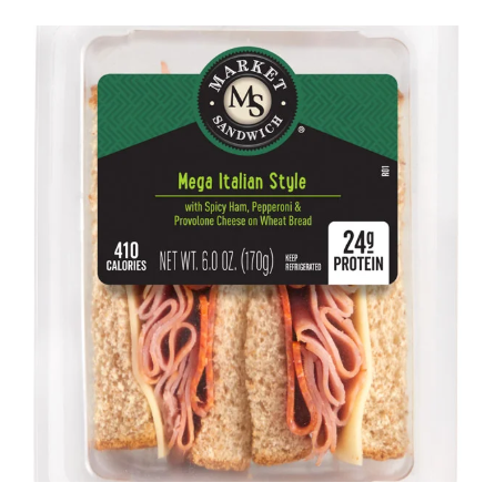 EA Sween Market Sandwich Mega Italian2 halves 6oz is piled high with a hearty mix of spicy ham, pepperoni and smooth provolone cheese on wheat bread. Fully cooked perfect for a quick meal or snack this deli sandwich is made with quality ingredients and packed with 24g of protein. Food prep method is refrigerated ready-to-eat sandwich is sealed in air-tight packaging to maintain its fresh taste. Contains: Milk, sesame, wheat.