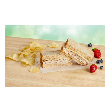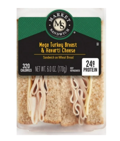 EA Sween Market Sandwich Mega Turkey Breast & Havarti Cheese 2 halves 6oz is made with turkey breast and slices of Havarti cheese on a flavorful wheat bread. Fully cooked perfect for a quick meal or snack this deli sandwich is made with quality ingredients and packed with protein. Food preparation method is is refrigereated Ready-to-Eat sandwich is sealed in air-tight packaging to maintain its fresh taste. No allergens present.