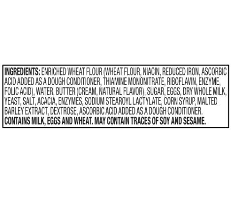 Enriched Wheat Flour (Wheat Flour, Niacin, Reduced Iron, Ascorbic Acid added as Dough Conditioner, Thiamine Mononitrate, Riboflavin, Folic Acid, Enzyme), Butter (Cream [Milk], Natural Flavor), Water, Sugar, Eggs, Dry Whole Milk, Yeast, Salt, Acacia, Enzymes, Sodium Stearoyl Lactylate, Malted Barley Flour, Dextrose, Ascorbic Acid