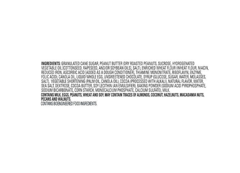 GRANULATED CANE SUGAR, PEANUT BUTTER (DRY ROASTED PEANUTS, SUCROSE, HYDROGENATED VEGETABLE OIL [COTTONSEED, RAPESEED, AND/OR SOYBEAN OILS], SALT), ENRICHED WHEAT FLOUR (WHEAT FLOUR, NIACIN, REDUCED IRON, ASCORBIC ACID [ADDED AS A DOUGH CONDITIONER], THIAMINE MONONITRATE, RIBOFLAVIN, ENZYME, FOLIC ACID), CANOLA OIL, LIQUID WHOLE EGG, UNSWEETENED CHOCOLATE, SYRUP (GLUCOSE, SUGAR, WATER, MOLASSES, SALT), VEGETABLE SHORTENING (PALM OIL, CANOLA OIL), COCOA (PROCESSED WITH ALKALI), NATURAL FLAVOR, WATER, SEA SALT, DEXTROSE, COCOA BUTTER, SOY LECITHIN (AN EMULSIFIER), BAKING POWDER (SODIUM ACID PYROPHOSPHATE, SODIUM BICARBONATE, CORN STARCH, MONOCALCIUM PHOSPHATE, CALCIUM SULFATE), MILK.