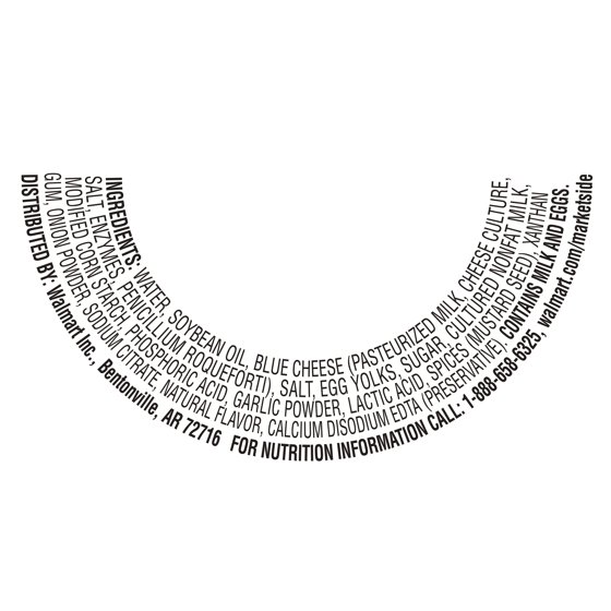 Water, soybean oil, blue cheese (pasteurized milk, cheese culture, salt, enzymes, peniciilium roquefortii), salt, egg yolks, sugar, cultured nonfat milk, modified corn starch, phosphoric acid, garlic powder, lactic acid, spices (mustard seed), xanthan gum, onion powder, sodium citrate, natural flavor, calcium disodium EDTA (preservative).