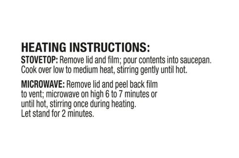 Heating instructions. Stovetop - From Chilled **Heating Instructions: Remove lid and film, pour contents into saucepan. Cook over low to medium heat, stirring gently until hot. (165 degrees) **Microwave - From Chilled **Heating Instructions: Remove lid and peel back film to vent, microwave on high 6 to 7 minutes or until hot (165 degrees), stirring once during heating. **Use caution when handling hot cup.