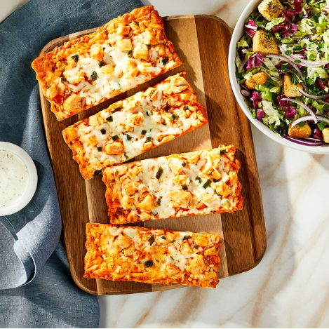 CRUST (ENRICHED WHEAT FLOUR [WHEAT FLOUR, NIACIN, REDUCED IRON, THIAMINE MONONITRATE, RIBOFLAVIN, FOLIC ACID], WATER, PALM OIL, BREAD CRUMBS [WHEAT FLOUR, SUGAR, YEAST, SALT], CONTAINS 2% OR LESS OF: YEAST, SOYBEAN OIL, SALT, OAT BRAN, SUGAR, OAT FIBER, NONFAT DRY MILK, WHEAT FLOUR, ENZYMES), LOW MOISTURE MOZZARELLA CHEESE (PASTEURIZED MILK, CHEESE CULTURES, SALT, ENZYMES), FULLY COOKED DICED CHICKEN WITH GRILL MARKS (CHICKEN BREAST, WATER, POTATO STARCH, SALT, ROSEMARY EXTRACT), BUFFALO WING SAUCE (DISTILLED VINEGAR, CAYENNE RED PEPPERS, SALT, WATER, CANOLA OIL, PAPRIKA [COLOR], XANTHAN GUM [THICKENER], GARLIC POWDER, NATURAL FLAVOR), CRÈME FRAÎCHE (PASTEURIZED CULTURED CREAM, ASCORBIC ACID [TO MAINTAIN FRESHNESS], CITRIC ACID), CONTAINS 2% OR LESS OF: GREEN ONIONS, DEHYDRATED GARLIC. CONTAINS MILK AND WHEAT.
