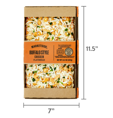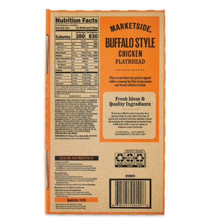 The Marketside Buffalo Style Chicken Flatbread Pizza starts with a scrumptious thin crust that is loaded with delicious toppings. This flatbread features diced chicken breast with a creamy buffalo wing sauce on a thin flatbread crust. This delicious flatbread is made with mouthwatering authentic flavors. Personalize it and serve it with your favorite blend of veggies or salad to round out the meal. This flatbread pizza is an excellent source of protein and is USDA inspected. Simply bake for 10 to 12 minutes and enjoy great tasting, restaurant quality pizza right in the comfort of your own home. Treat the family tonight to a Marketside Buffalo Style Chicken Flatbread Pizza.