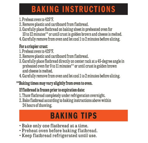 Baking Instructions: 1. Preheat oven to 425°F. 2. Remove plastic and cardboard from flatbread. 3. Carefully place flatbread on baking sheet in preheated oven for 10 to 12 minutes* or until crust is golden brown and cheese is melted. 4. Carefully remove from oven and let cool 1 to 2 minutes before slicing. For a crispier crust: 1. Preheat oven to 425°F. 2. Remove plastic and cardboard from flatbread. 3. Carefully place flatbread directly on center rack at a 45 degree angle in preheated oven for 9 to 11 minutes* or until crust is golden brown and cheese is melted. 4. Carefully remove from oven and let cool 1 to 2 minutes before slicing. * Baking times may vary slightly from oven to oven. If flatbread is frozen prior to expiration date: 1. Thaw flatbread completely under refrigeration overnight. 2. Bake flatbread according to baking instructions above within 24 hours of thawing.