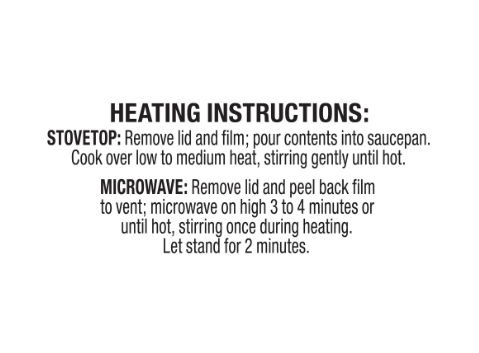 Heating instructions. Stovetop - From Chilled **Heating Instructions: Remove lid and film, pour contents into saucepan. Cook over low to medium heat, stirring gently until hot. (165 degrees) **Microwave - From Chilled **Heating Instructions: Remove lid and peel back film to vent, microwave on high 6 to 7 minutes or until hot (165 degrees), stirring once during heating. **Use caution when handling hot cup.