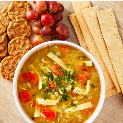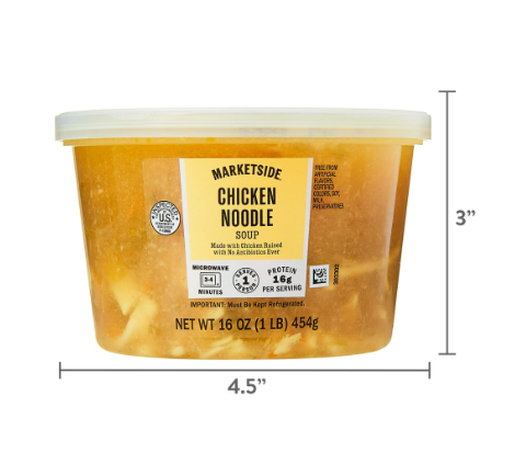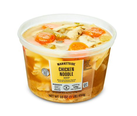 Our Marketside Chicken Noodle Soup is hand-crafted with real chicken stock – just like you would use in your own kitchen. We add real tender chicken breast meat that has never had antibiotics, add in carrots, celery, and onions and every spoonful brings the satisfaction that you’re getting chicken noodle soup how it's supposed to be. Seasoned with parsley, rosemary and thyme, our Marketside Chicken Noodle soup will bring back memories of family dinners and great times that you want to have this soup with every meal. This authentic chicken soup comes in a convenient resealable, microwave-safe plastic container that helps to maintain freshness while making it incredibly easy to heat and enjoy – you'll have delicious restaurant style soup ready in minutes!