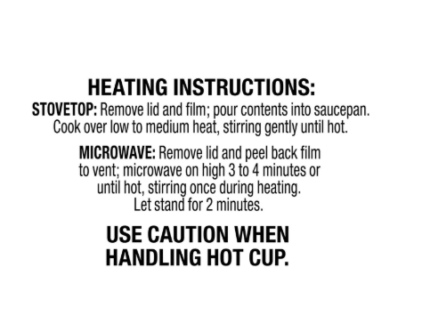 Heating instructions. Stovetop - From Chilled **Heating Instructions: Remove lid and film, pour contents into saucepan. Cook over low to medium heat, stirring gently until hot. (165 degrees) **Microwave - From Chilled **Heating Instructions: Remove lid and peel back film to vent, microwave on high 6 to 7 minutes or until hot (165 degrees), stirring once during heating. **Use caution when handling hot cup.