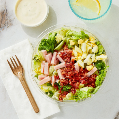 Vegetables: Iceberg Lettuce, Greenleaf Lettuce; Dressing: Vegetable Oil (Canola and/or Soybean Oil), Nonfat Buttermilk (Whey, Water, Skim Milk Powder, Cornstarch, Tapioca Starch, Carrageenan, Locust Bean Gum, Culture), Water, Blue Cheese (Milk, Salt, Culture, Enzymes), Egg Yolk, Less than 2% of Dried Garlic, Spice, Distilled Vinegar, Salt, Sugar, Phosphoric Acid, Natural Flavor, Stabilizer Blend (Xanthan Gum, Carrageenan), Ground Mustard, Polysorbate 60, Turmeric Extract, Citric Acid, Maltodextrin, Cultured Dextrose; Smoked Turkey: Turkey Breast, Turkey Broth, Contains 2% or Less of Salt, Dextrose, Sodium Phosphate, Modified Food Starch, Carrageenan, Natural Flavoring, Sodium Lactate, Sodium Diacetate, Natural Smoke Flavor, Sodium Nitrite, Ascorbic Acid, Citric Acid; Bacon: Bacon Cured with: Water, Salt, Sodium Phosphate, Sodium Erythorbate, Sodium Nitrite, May Also Contain: Sugar; Eggs: Hard Cooked Eggs, Citric Acid, Sodium Benzoate, and Nisin Preparation (as Preservatives).