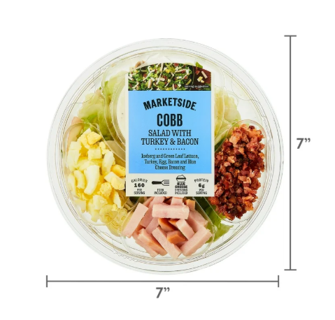 For a quick and wholesome meal or side dish grab a Marketside Cobb Salad with Turkey and Bacon. Our delicious, classic Cobb salad comes in a single-serve plastic bowl with crispy iceberg and green leaf lettuce. Hard-boiled egg, turkey, and bacon, with a blue cheese dressing, make this salad complete. There are only about 320 calories in this yummy little meal with a whopping 12 grams of protein. Spice up your daily routine and bring home a Marketside Cobb Salad with Turkey and Bacon today.