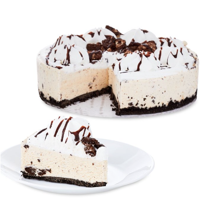 • Creamy vanilla ice cream with chocolate sandwich cookies on a chocolate cookie crust topped with whipped topping, cookie pieces and chocolate flavored drizzle