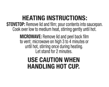Heating instructions. Stovetop - From Chilled **Heating Instructions: Remove lid and film, pour contents into saucepan. Cook over low to medium heat, stirring gently until hot. (165 degrees) **Microwave - From Chilled **Heating Instructions: Remove lid and peel back film to vent, microwave on high 6 to 7 minutes or until hot (165 degrees), stirring once during heating. **Use caution when handling hot cup.