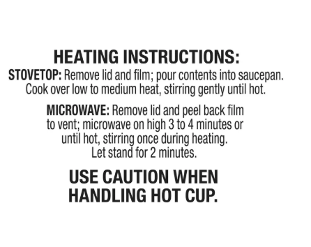 Heating instructions. Stovetop - From Chilled **Heating Instructions: Remove lid and film, pour contents into saucepan. Cook over low to medium heat, stirring gently until hot. (165 degrees) **Microwave - From Chilled **Heating Instructions: Remove lid and peel back film to vent, microwave on high 6 to 7 minutes or until hot (165 degrees), stirring once during heating. **Use caution when handling hot cup.