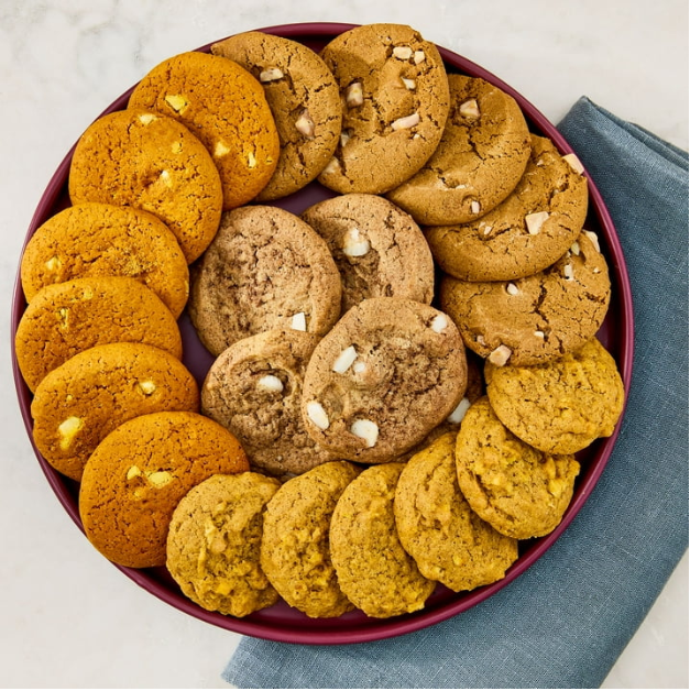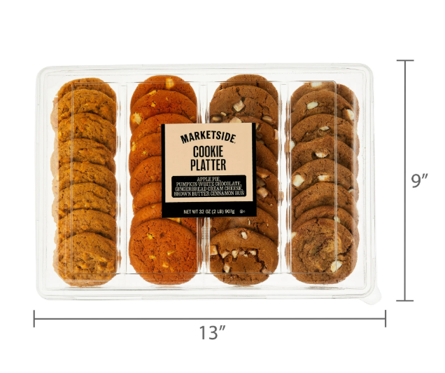 Bring the flavors of the season to your table with the Marketside Fall Bakery Cookie Platter. This generous assortment features four festive varieties: apple pie, pumpkin white chocolate, gingerbread cream cheese, and brown butter cinnamon bun. Each cookie is soft, flavorful, and baked to capture the cozy taste of fall. With thirty-two cookies included, this platter is perfect for parties, gatherings, or sharing with friends and family. Ready to serve and enjoy, it makes celebrating the season simple and delicious. Treat everyone to the rich seasonal flavors of the Marketside Fall Bakery Cookie Platter.