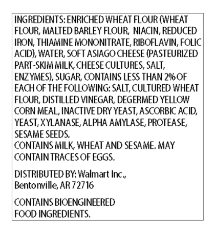 ENRICHED WHEAT FLOUR (WHEAT FLOUR, MALTED BARLEY FLOUR, NIACIN, REDUCED IRON, THIAMINE MONONITRATE, RIBOFLAVIN, FOLIC ACID), WATER, SOFT ASIAGO CHEESE (PASTEURIZED PART-SKIM MILK, CHEESE CULTURES, SALT, ENZYMES), SUGAR, CONTAINS LESS THAN 2% OF EACH OF THE FOLLOWING: SALT, CULTURED WHEAT FLOUR, DISTILLED VINEGAR, DEGERMED YELLOW CORN MEAL, INACTIVE DRY YEAST, ASCORBIC ACID, YEAST, XYLANASE, ALPHA AMYLASE, PROTEASE, SESAME SEEDS.