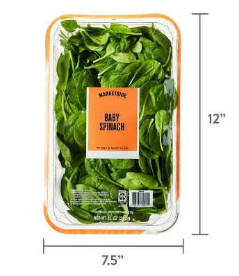Marketside Baby Spinach has a smooth, tender texture and a great fresh taste. This spinach is picked fresh, washed, and ready to eat for your convenience. Use it to create your personalized salad with your favorite vegetables, protein, nuts, and dressing. It can also be used as a topping on sandwiches and pizzas or enjoyed as a side dish. Packaged in a resealable container, it keeps your spinach fresh after every use. Enjoy the fresh-from-the-farm taste with Marketside Baby Spinach.