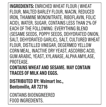 ENRICHED WHEAT FLOUR (WHEAT FLOUR, MALTED BARLEY FLOUR, NIACIN, REDUCED IRON, THIAMINE MONONITRATE, RIBOFLAVIN, FOLIC ACID), WATER, SUGAR, CONTAINS LESS THAN 2% OF EACH OF THE FOLLOWING: EVERYTHING BLEND (SESAME SEEDS, POPPY SEEDS, DEHYDRATED ONION, SALT, AND DEHYDRATED GARLIC), SALT, CULTURED WHEAT FLOUR, DISTILLED VINEGAR, DEGERMED YELLOW CORN MEAL, iNACTIVE DRY YEAST, ASCORBIC ACID, GUM ARABIC, YEAST, XYLANASE, ALPHA AMYLASE, PROTEASE.