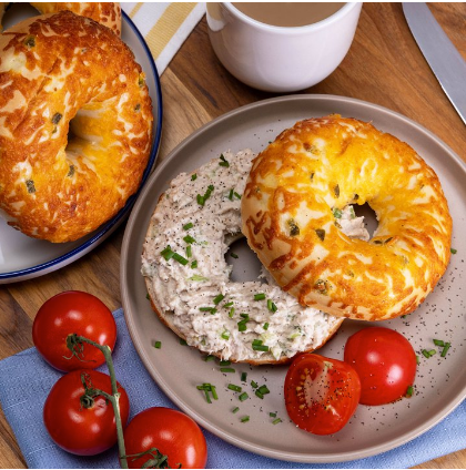 - Topped with melted cheddar cheese and jalapeno peppers inside the bagel.