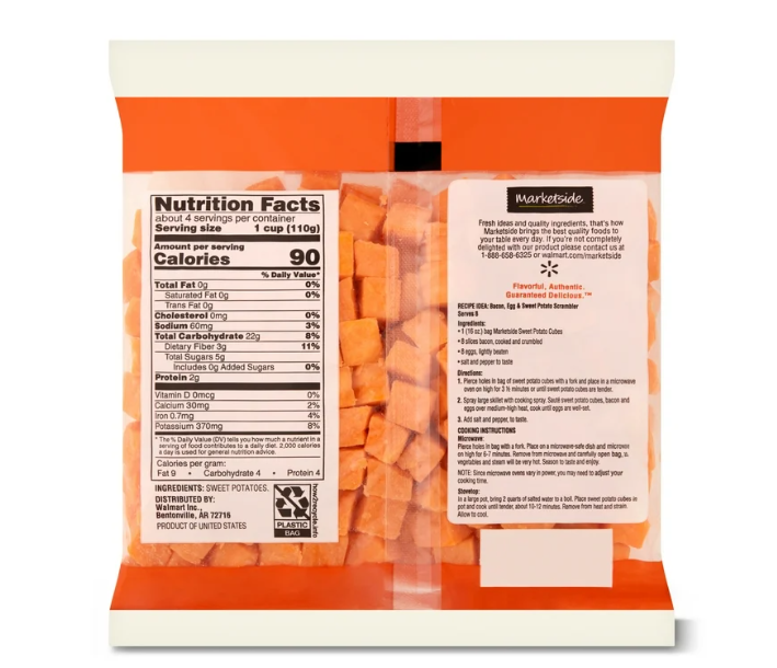 Marketside Sweet Potato Cubes are a delicious and easy side dish that is perfect when you?re looking for a nutritious side that?s quick to prepare; it steams right in the bag! These sweet potato cubes allow you all the convenience of your canned vegetables with no can openers or pantry-cramming necessary. Use them to whip up a delicious side, or incorporate them into your favorite meals from soups and casseroles to stir fries and more. With Marketside Sweet Potato Cubes, your friends and family can enjoy food without having to worry about artificial ingredients. For tasty, vegetables from a brand you can trust, Marketside Sweet Potato Cubes.Fresh ideas and quality ingredients, that's how Marketside brings the best foods to your table. We are committed to deliver freshness that you can taste and see. Marketside offers the best in fresh food, guaranteed by Walmart, working in partnership with farmers, bakers and chefs for the highest quality, authentic ingredients and favorite recipes.