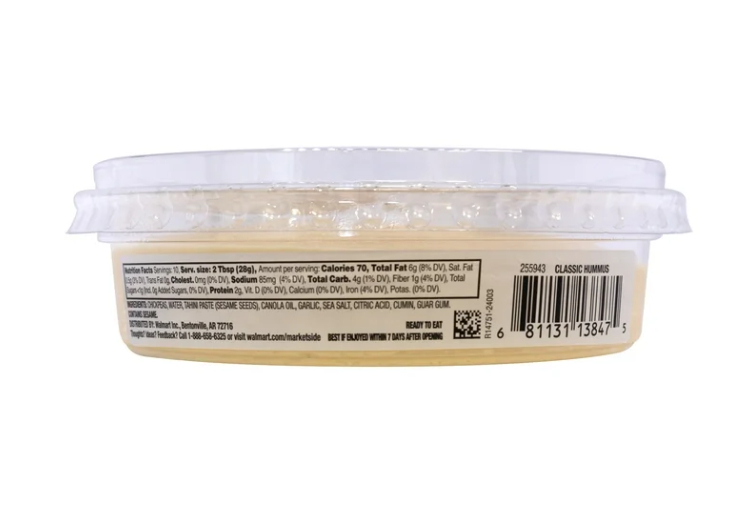 Marketside Gluten-Free, Classic Hummus is a classic favorite traditional hummus offering with golden toasted pine nuts in a perfect herbal dressing. Pair with assorted vegetables and pita chips, Spread on sandwiches, wraps, and flatbreads. Perfect for parties! Cooked. Ready to Eat. Comes in a resealable plastic container with a lid 2 Tbsp. (28g) servings. No preservatives or artificial flavors.