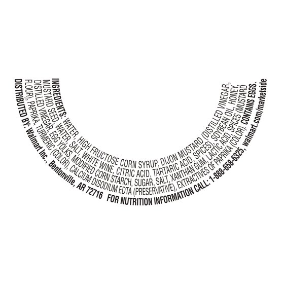Water, high fructose corn syrup, dijon mustard (distilled vinegar, mustard seed, water, salt, white wine, citric acid, tartaric acid, spices), soybean oil, honey, distilled vinegar, egg yolks, modified corn starch, sugar, salt, xanthan gum, lactic acid, spices (mustard flour), paprika, turmeric (color), calcium disodium EDTA (preservative), extractives of paprika (color).