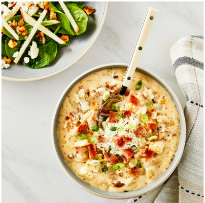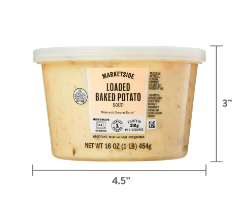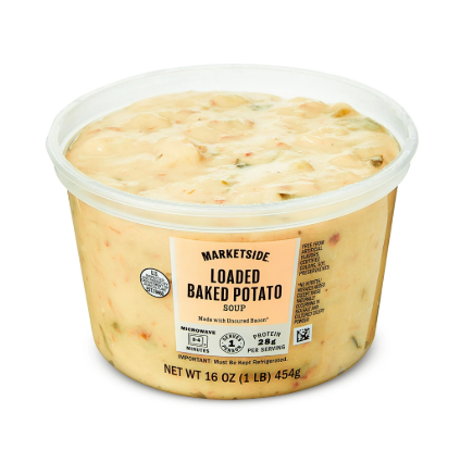 Our Marketside Loaded Potato Soup is full of homestyle cuts of potatoes simmered with a blend of seasonings and uncured bacon all in a rich cream sauce, topped off with chopped scallions and chives. Real handcrafted chicken stock is used, just like you made it at home that delivers soul-satisfying comfort every time. Try serving it with a fresh salad, a sandwich, or on its own. This loaded soup comes in a convenient resealable, microwave-safe plastic container that helps to maintain freshness while making it incredibly easy to heat and enjoy. Just pop it in the microwave and you have delicious restaurant-style soup ready to go! Take home the Marketside Loaded Potato Soup today!