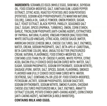 SCRAMBLED EGGS (WHOLE EGGS, SKIM MILK, SOYBEAN OIL, FOOD STARCH-MODIFIED, SALT, XANTHAN GUM, LIQUID PEPPER EXTRACT, CITRIC ACID), ROASTED POTATOES (RED SKIN POTATOES [POTATOES, SODIUM ACID PYROPHOSPHATE {TO MAINTAIN NATURAL COLOR}], CANOLA OIL, GARLIC POWDER, ONION POWDER, SUGAR, SALT, YEAST EXTRACT, BLACK PEPPER, PARSLEY, SEASONED SALT [SALT, SUGAR, SPICES {PAPRIKA, TURMERIC], ONION, CORN STARCH, GARLIC, TRICALCIUM PHOSPHATE {ANTI-CAKING AGENT], EXTRACTIVES OF PAPRIKA, NATURAL FLAVOR], VINEGAR POWDER [MALTODEXTRIN, WHITE DISTILLED VINEGAR], CITRIC ACID), CHEESE SAUCE (WATER, AMERICAN CHEESE [CHEESE {MILK, CHEESE CULTURES, SALT, ENZYMES}, WATER, CREAM, SODIUM PHOSPHATE, SALT, BETA-APO-8'-CAROTENAL, BETA-CAROTENE COLOR], MILK, UNSALTED BUTTER [PASTEURIZED CREAM, NATURAL FLAVORINGS], FOOD STARCH-MODIFIED, SALT, CONTAINS LESS THAN 2% OF: CHEESE FLAVORS, WHITE PEPPER, CITRIC ACID), BACON (FULLY COOKED DICED BACON CURED WITH: WATER, SALT, SUGAR, SODIUM PHOSPHATES, SODIUM ERYTHORBATE, SODIUM NITRITE), SAUSAGE (PORK, WATER, SALT, SPICES, SUGAR, FLAVORING), SMOKED FLAVORED HAM (FULLY COOKED DICED HAM CURED WITH: WATER, DEXTROSE, SALT, CONTAINS 2% OR LESS OF: FOOD STARCH-MODIFIED, POTASSIUM LACTATE, SODIUM PHOSPHATES, SODIUM DIACETATE, SODIUM ERYTHORBATE, SODIUM NITRITE, SMOKE FLAVOR), CHEDDAR CHEESE (CULTURED PASTEURIZED MILK, SALT, ENZYMES, ANNATTO EXTRACT [COLOR], POTATO STARCH [ANTI-CAKING AGENT], CORN STARCH [ANTI-CAKING AGENT], NATAMYCIN [A MOLD INHIBITOR]). CONTAINS MILK AND EGGS.