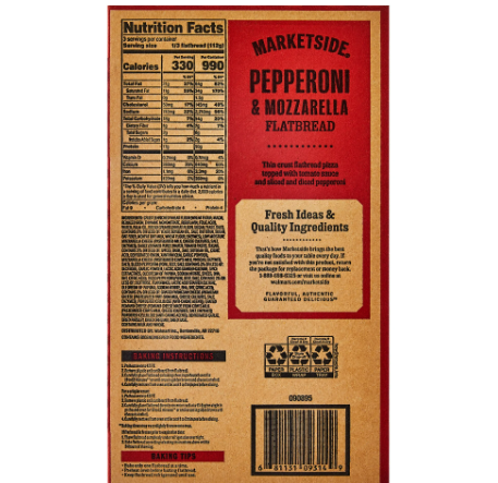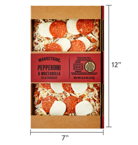 Marketside Pepperoni and Mozzarella Flatbread Pizza starts with a thin crust topped with a red tomato sauce with Italian-style spices and a blend of whole milk mozzarella, fresh mozzarella, Parmesan, and Romano cheeses. Finally, we top the flatbread pizza with sliced and diced premium pepperoni. Personalize it and top it with your favorite blend of veggies, or serve it with a fresh salad and crunchy mozzarella sticks. Simply bake for 10 to 12 minutes and enjoy great-tasting, restaurant-quality pizza right in the comfort of your own home. Treat the family tonight to Marketside Pepperoni and Mozzarella Flatbread Pizza.