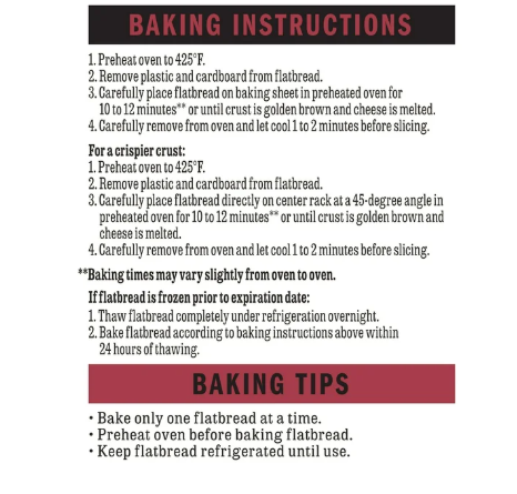 Baking Instructions: 1. Preheat oven to 425°F. 2. Remove plastic and cardboard from flatbread. 3. Carefully place flatbread on baking sheet in preheated oven for 10 to 12 minutes* or until crust is golden brown and cheese is melted. 4. Carefully remove from oven and let cool 1 to 2 minutes before slicing. For a crispier crust: 1. Preheat oven to 425°F. 2. Remove plastic and cardboard from flatbread. 3. Carefully place flatbread directly on center rack at a 45 degree angle in preheated oven for 10 to 12 minutes* or until crust is golden brown and cheese is melted. 4. Carefully remove from oven and let cool 1 to 2 minutes before slicing. * Baking times may vary slightly from oven to oven. If flatbread is frozen prior to expiration date: 1. Thaw flatbread completely under refrigeration overnight. 2. Bake flatbread according to baking instructions above within 24 hours of thawing.